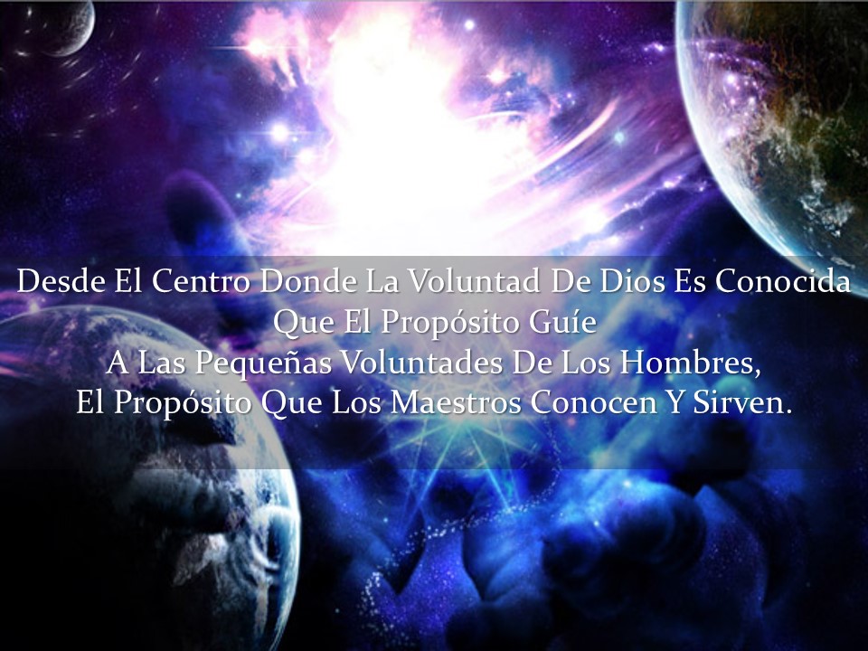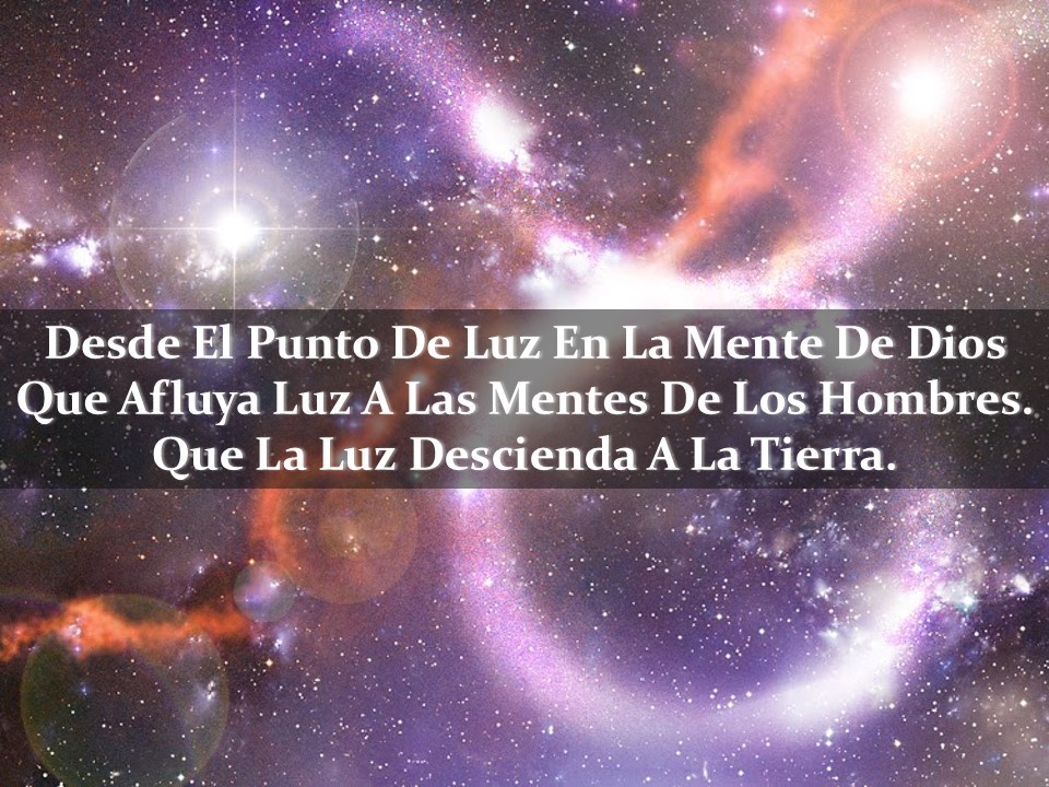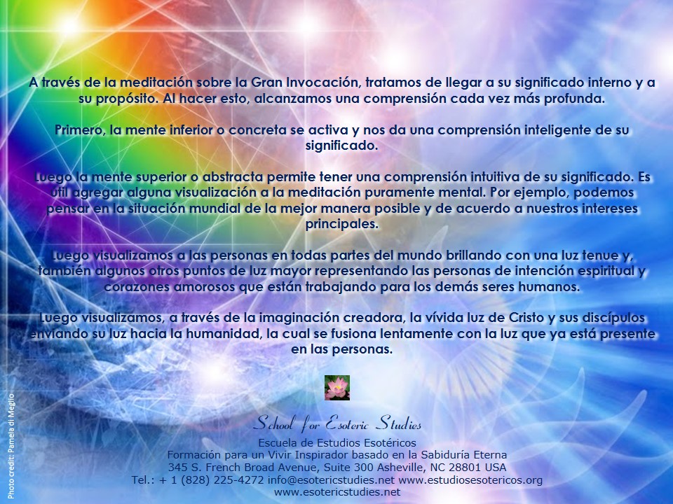 La Gran Invocación incluye una triple invocación basada en las enseñanzas de la Sabiduría Eterna. Es un apelo a la Luz sobre nuestro camino para que la Luz fluya a los lugares oscuros de la tierra. Es un apelo a que exista más Amor en el mundo, más sentido de hermandad y rectas relaciones con nuestros semejantes. Se trata de un apelo a la voluntad-al-bien, la voluntad de Dios, para que se exprese más plenamente en la Tierra y más verdaderamente en los corazones y las mentes de todas las personas. Para recibir señaladores con La Gran Invocación, mandarnos un email a: outreach@esotericstudies.net.