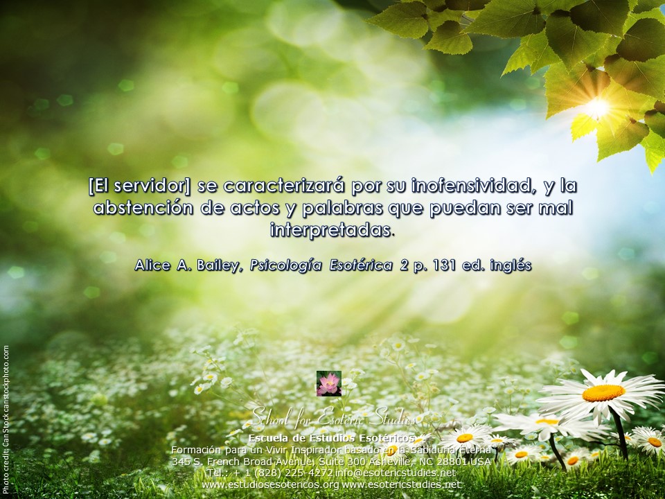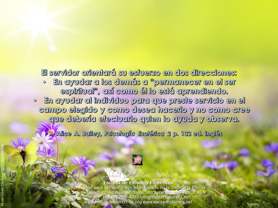 El servicio es la expresión natural del desenvolvimiento del Alma, un «instinto» del Alma como dice el Maestro Djwhal Khul. ¿Qué actividades de servicio podemos observar a nuestro alrededor, en nuestro entorno y en el mundo en general? Concentrándonos en ellos ayudamos a multiplicar el efecto del servicio espiritual.