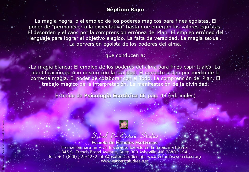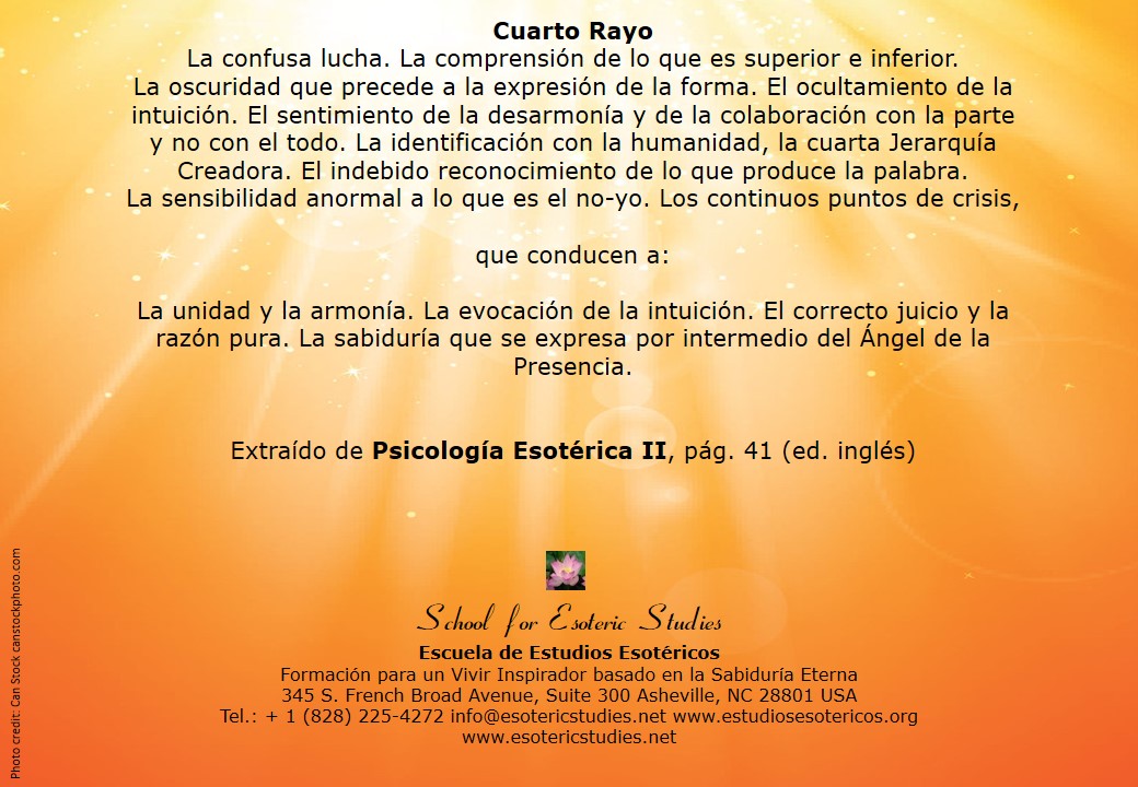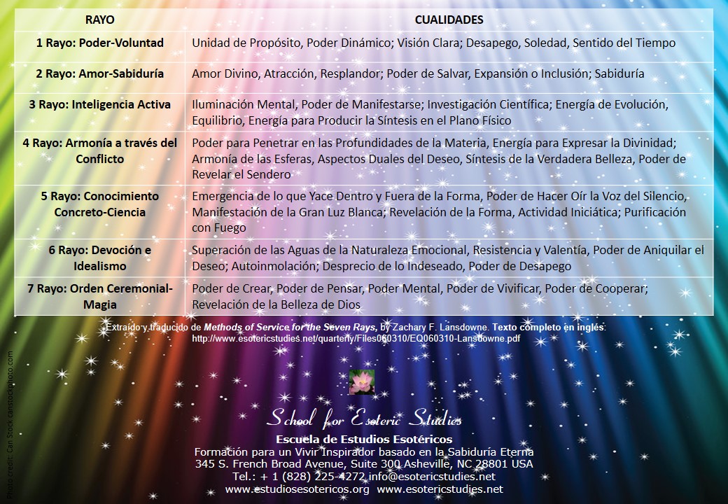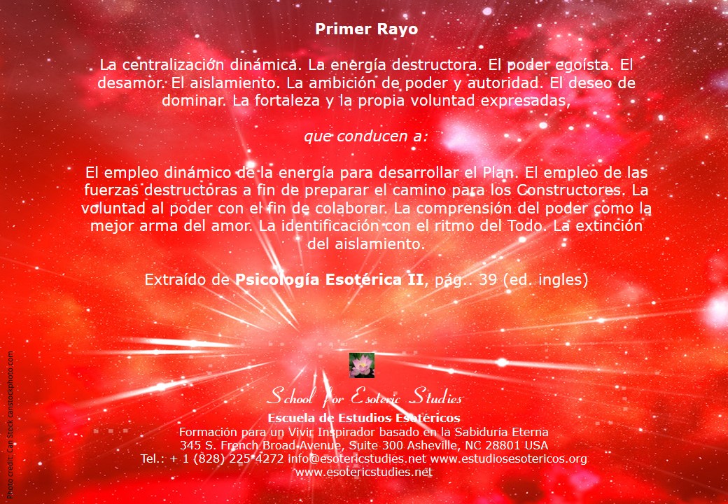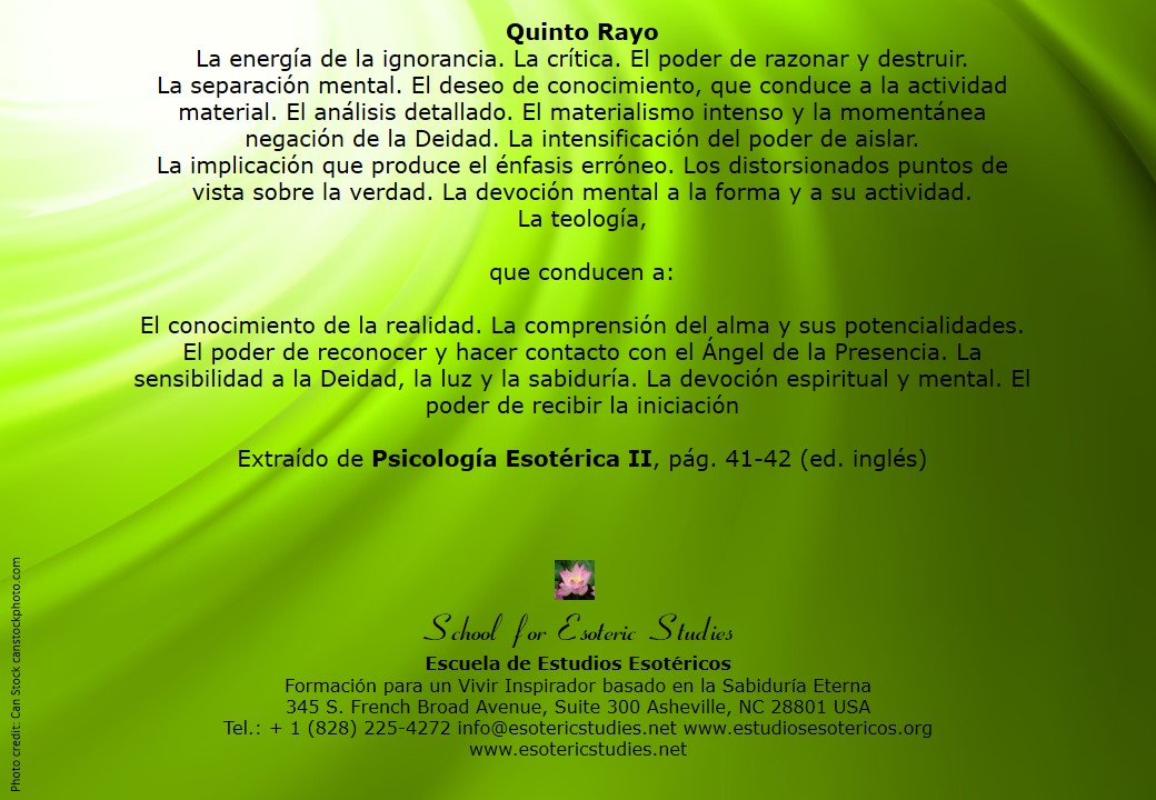 La psicología esotérica es una ciencia del Alma basada en cómo los Siete Rayos impactan nuestros vehículos y vidas en tanto ellos son energías cósmicas que cualifican nuestra existencia. Estas influencias de Rayo afectan al individuo, al grupo, a la nación y al planeta. Los estudiantes de la Escuela de Estudios Esotéricos aprenden a integrar y trabajar con estas energías en sus propias vidas y en la participación al Proyecto de Grupo de la Escuela.