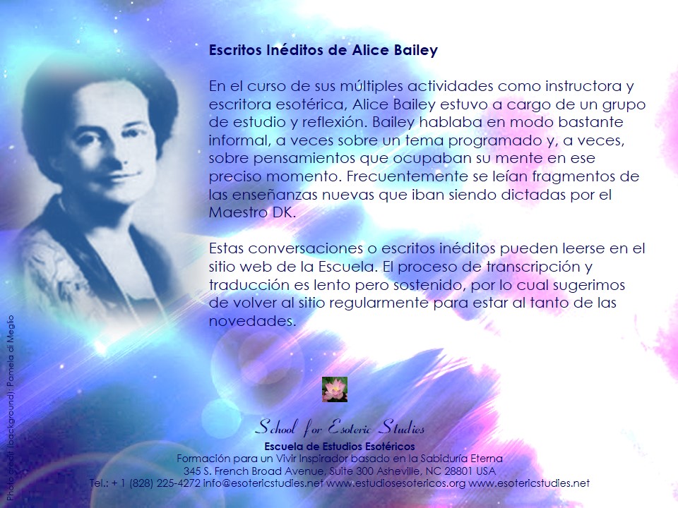Esta serie de imágenes y citas de varias fuentes de la Sabiduría Eterna se centra en el significado esotérico de términos de uso común que se analizan con más detalle en el arco de formación de la Escuela de Estudios Esotéricos y en los charlas de Alice Bailey.